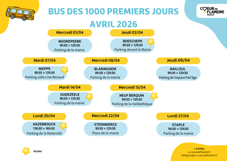 Depuis fin janvier, le bus des 1000 premiers jours sillonne les routes du Cœur de Flandre. Service gratuit et accessible à tous, ce bus est un lieu d’écoute, d’accompagnement et de soutien à la parentalité.
